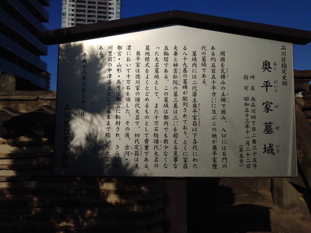 南品川には、立派なお寺が多くある。そこに奥平家の墓所があった。すぐ隣接するようにして沢庵和尚で有名な東海寺。東海寺は徳川家光に破格の扱いを受けた。細川家の墓所も、奥平家の川向こうにある。その川は目黒川と呼ぶ。ここが北品川と南品川の境界である。目黒川の上流が目黒である。